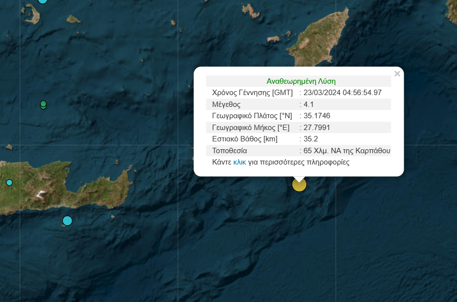 Σεισμός 4,1 Ρίχτερ σημειώθηκε 65 χλμ. νοτιοανατολικά της Καρπάθου στις 6.56 το πρωί, σύμφωνα με το Γεωδυναμικό Ινστιτούτο.Το εστιακό βάθος της σεισμικής δόνησης υπολογίστηκε στα 35,2 χλμ.