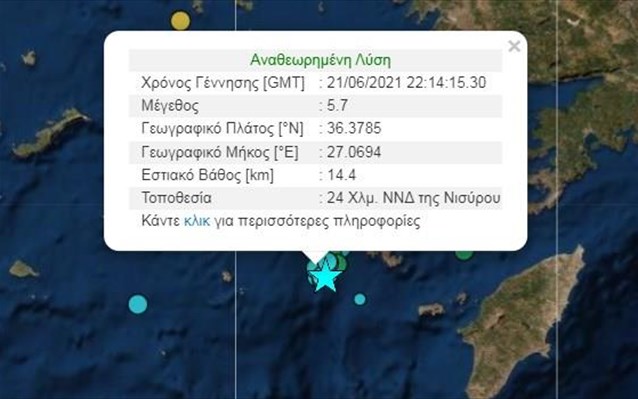 Σεισμική δόνηση μεγέθους 5,7 βαθμών της κλίμακας Ρίχτερ καταγράφηκε στη 01:14 στον θαλάσσιο χώρο 24 χιλιόμετρα νότια-νοτιοδυτικά της πόλης της Νισύρου, στα Δωδεκάνησα, σύμφωνα με ανακοίνωση του Γεωδυναμικού Ινστιτούτου του Εθνικού Αστεροσκοπείου Αθηνών, που τον χαρακτηρίζει «πολύ ισχυρό».