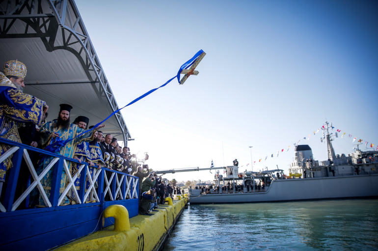 Η μέρα των Θεοφανείων ξεκινά με τον εκκλησιασμό των πιστών. Στους ναούς ψάλλεται, όπως και την προηγουμένη, η ακολουθία των «Μεγάλων Ωρών». Ακολούθως, ο Ιερέας και οι πιστοί θα βγουν από τον ναό και θα κατευθυνθούν στο σημείο, όπου θα γίνει η «κατάδυση του Σταυρού». Το σημείο αυτό είναι κάποιο λιμάνι, ποτάμι, πηγάδι, δεξαμενή ή απλά μια εξέδρα στο προαύλιο της εκκλησίας πάνω στην οποία, σε ειδικό σκεύος, θα γίνει η τελετή. Οι καμπάνες σημαίνουν χαρμόσυνα και ο Ιερέας ρίχνοντας τον σταυρό στο νερό ψάλλει το «Εν Ιορδάνη βαπτιζομένου σου, Κύριε».