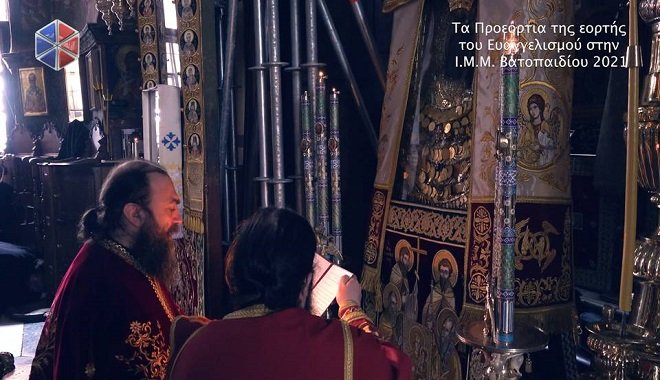 Κατά την ημέρα της Δεσποτικής και Θεομητορικής εορτής του Ευαγγελισμού της Θεοτόκου εορτάζει και πανηγυρίζει η Ιερά Μεγίστη Μονή Βατοπαιδίου καθώς το Καθολικό της Μονής είναι αφιερωμένο στον Ευαγγελισμό της Θεοτόκου.