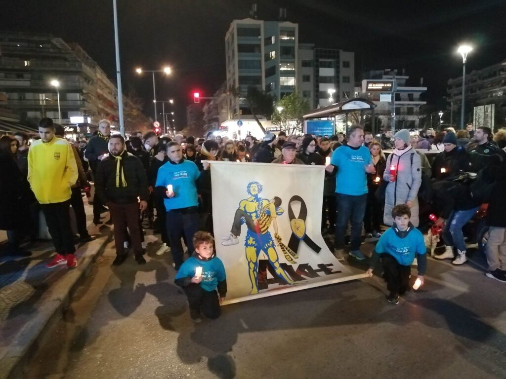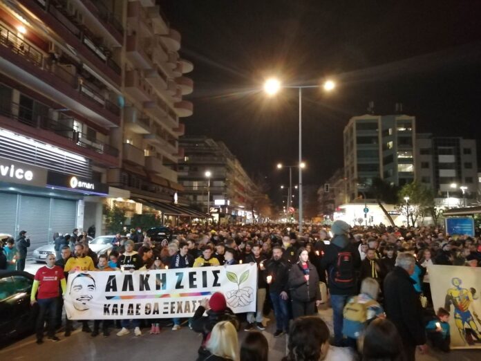 Η πορεία ξεκίνησε από το σημείο δολοφονίας του Άλκη στην οδό Θ. Γαζή, όπου λίγο νωρίτερα, κόσμος κάθε ηλικίας, από όλη την πόλη, ανάμεσά τους συγγενείς του Άλκη και ποδοσφαιριστές του Άρη, άναψαν κεριά και τήρησαν ενός λεπτού σιγή.