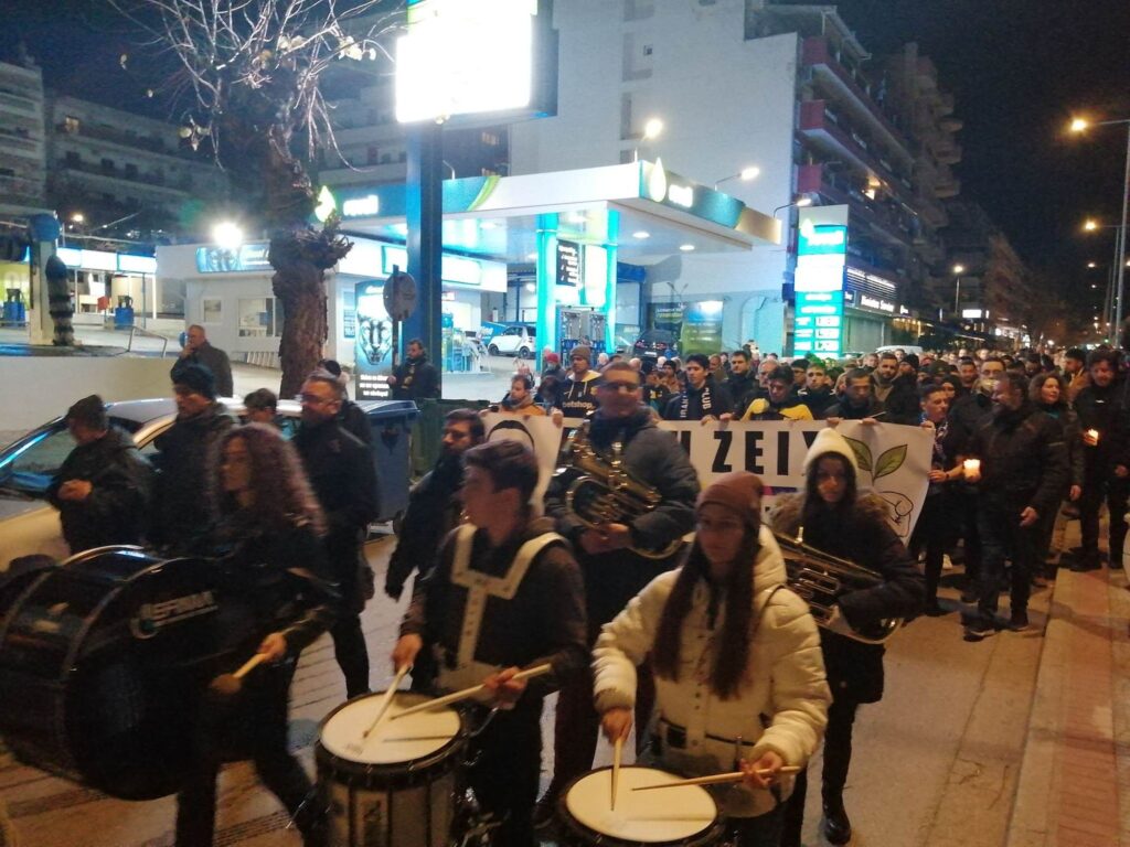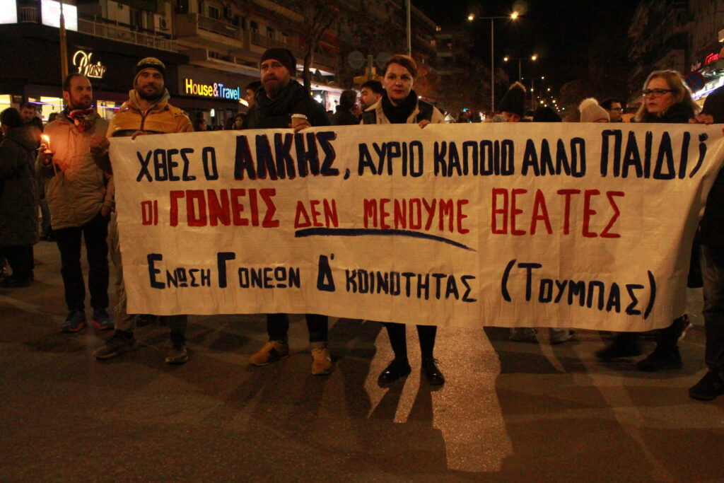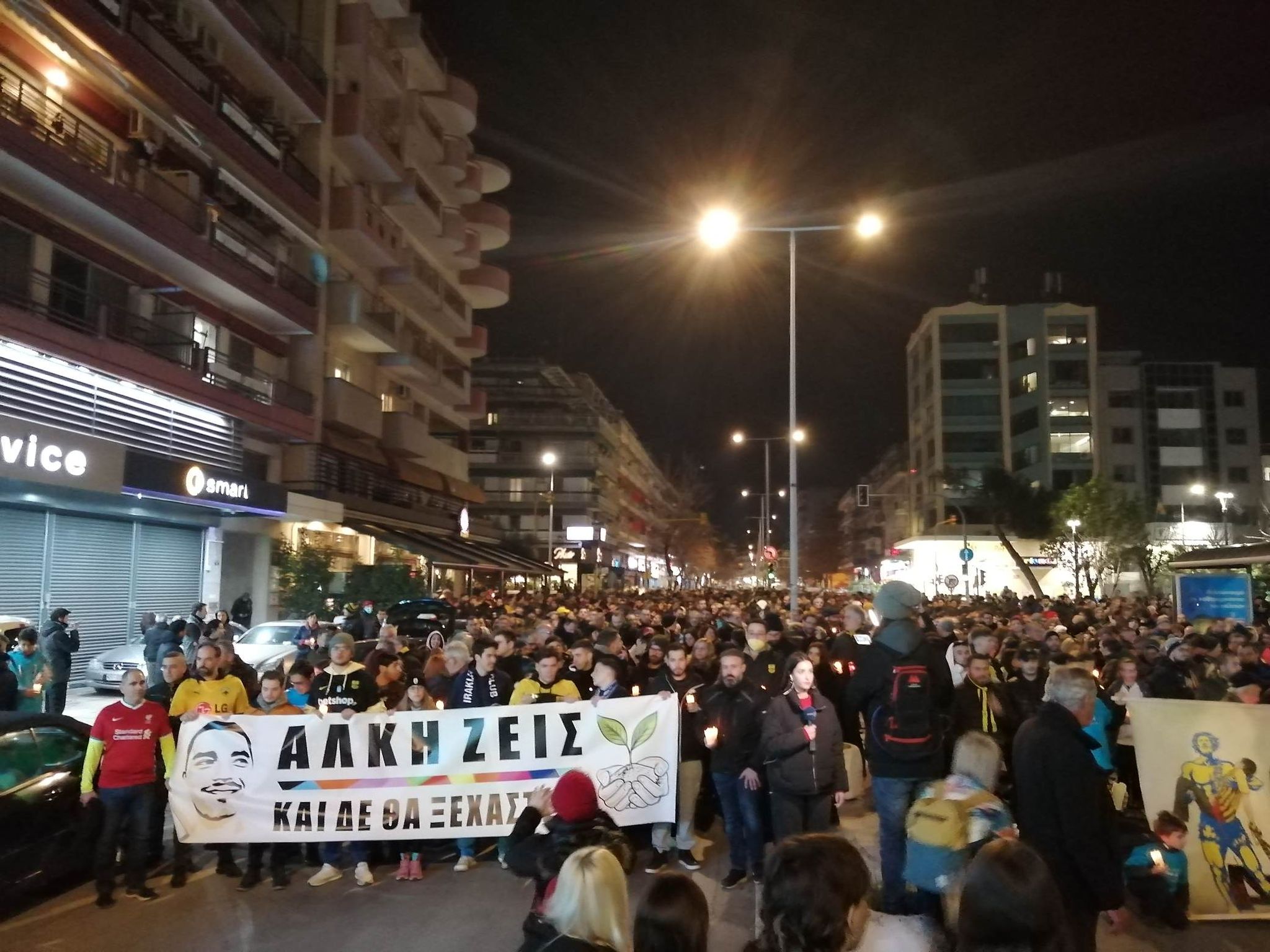 Η πορεία βρίσκεται αυτή τη στιγμή στην Λεωφόρο Στρατου και κατευθύνεται στο Λευκό Πύργο όπου και θα καταλήξει. Στην κεφαλή της πορείας βρίσκεται μια μικρή μπάντα κρουστών και πνευστών, ενώ από πίσω ακολουθει σιωπηλά ένα μεγάλο πλήθος κόσμου, που συγκεντρώθηκε για να τιμήσει με τον τρόπο αυτό τον άδικο χαμό του 19χρονου Άλκη Καμπανού.