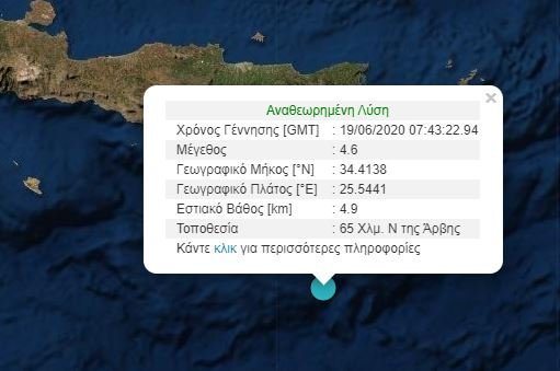 Ο σεισμός έγινε σε απόσταση 428 χλμ. νότια/νοτιοανατολικά της Αθήνας. Σύμφωνα με το Γεωδυναμικό Ινστιτούτο, το επίκεντρο της δόνησης εντοπίζεται στον θαλάσσιο χώρο 65 χλμ νότια της Άρβης στην Κρήτη