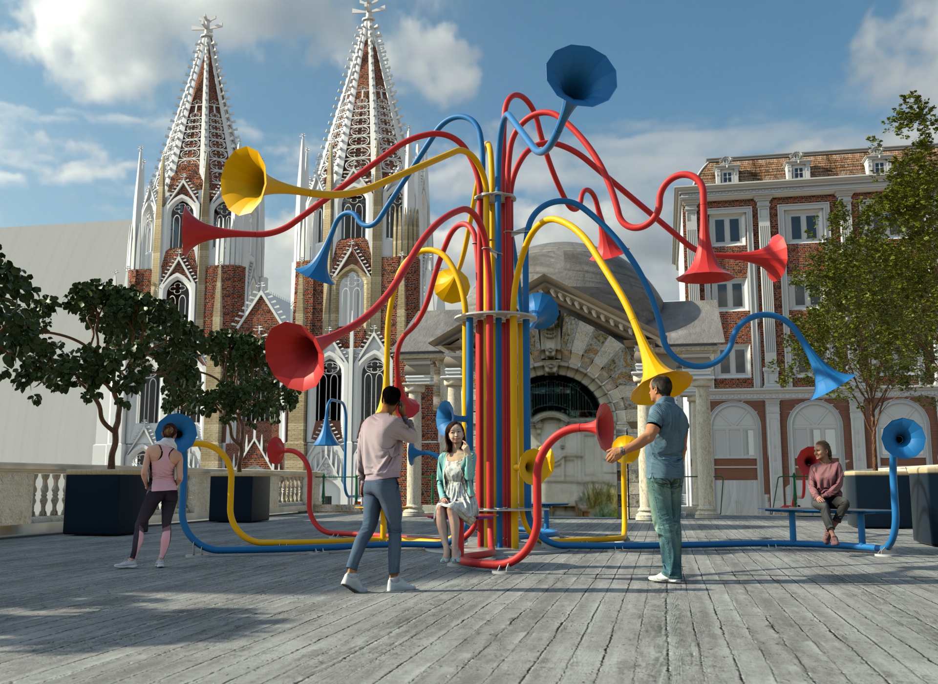 Το «Ηχητικό Άνθος» είναι ένα πλέγμα κόκκινων, κίτρινων και μπλε κεράτων τα οποία είναι διατεταγμένα ως ανθισμένο λουλούδι· κάθε ένα από αυτά είναι ένας σωλήνας ομιλίας και ο κόσμος μπορεί να επικοινωνεί μέσω των διασυνδεδεμένων σωλήνων των κεράτων και να ακούει τους ήχους που οι σωλήνες συλλαμβάνουν και ενισχύουν. Κάποια από τα κέρατα είναι στραμμένα προς τα πάνω για να συλλαμβάνουν τους ήχους της πόλης.