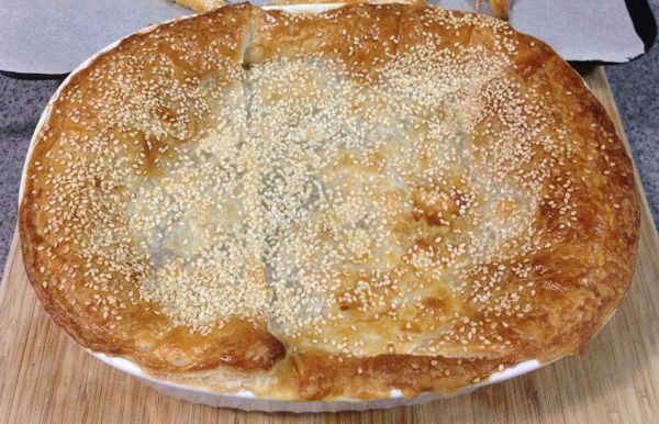 Πλένουμε και καβουρντίζουμε το σουσάμι. Προσθέτουμε τα καρύδια, την ζάχαρη, την κανέλα και το γαρύφαλλο. Στρώνουμε 7-8 φύλλα, αλείφοντάς τα με λάδι. Κατόπιν, αρχίζουμε να στρώνουμε διαδοχικά φύλλα με τη γέμιση. Στο τέλος, αφήνουμε μερικά φύλλα σκέτα. Μόλις τελειώσουμε με τη διαδικασία αυτή, καίμε 1/2 φλιτζάνι λάδι και το ρίχνουμε στην πίτα. Την ψήνουμε σε μέτριο φούρνο για 1 ώρα. Όταν κρυώσει η πίτα, βράζουμε το σιρόπι για 8’ λεπτά και τη σιροπιάζουμε.