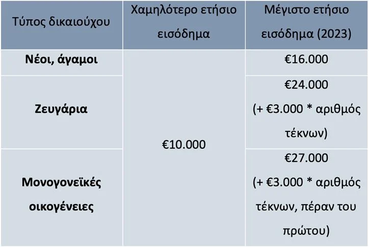 Το ετήσιο εισόδημα πρέπει να είναι τουλάχιστον 10.000 ευρώ ενώ το μέγιστο, εκείνο που ισχύει για την καταβολή του επιδόματος θέρμανσης. Για το 2023 τα όρια έχουν ως εξής: