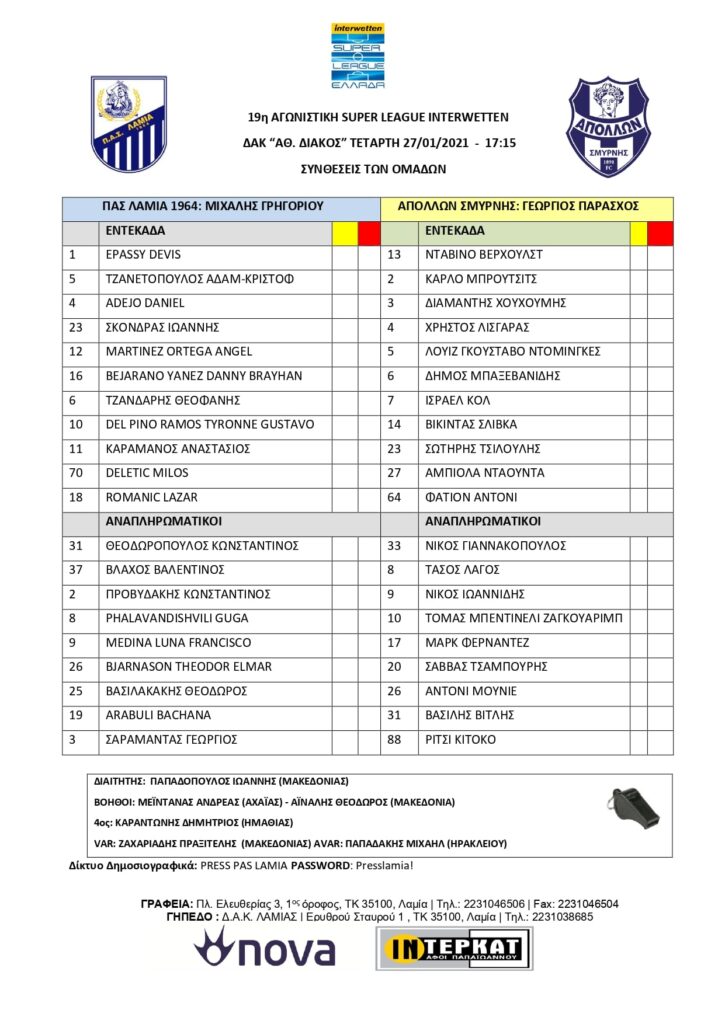 Οι ενδεκάδες του αγώνα Λαμία – Απόλλων Σμύρνης