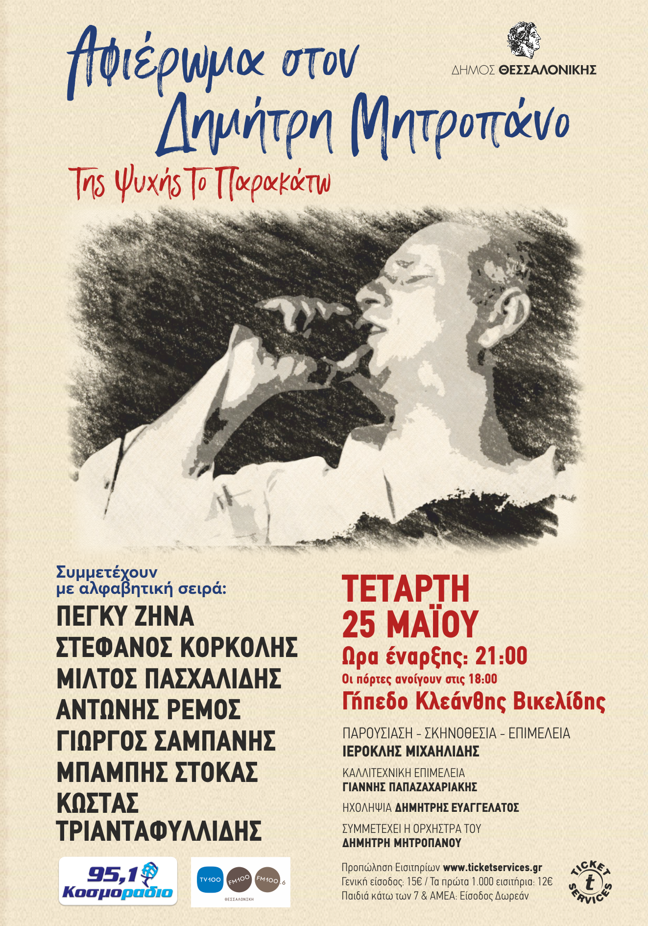 Ο Δήμος Θεσσαλονίκης, θέλοντας να τιμήσει τη μνήμη του, διοργανώνει μια μεγάλη συναυλία την Τετάρτη 25 Μαΐου στο γήπεδο Κλεάνθης Βικελίδης με τη συμμετοχή σημαντικών καλλιτεχνών.