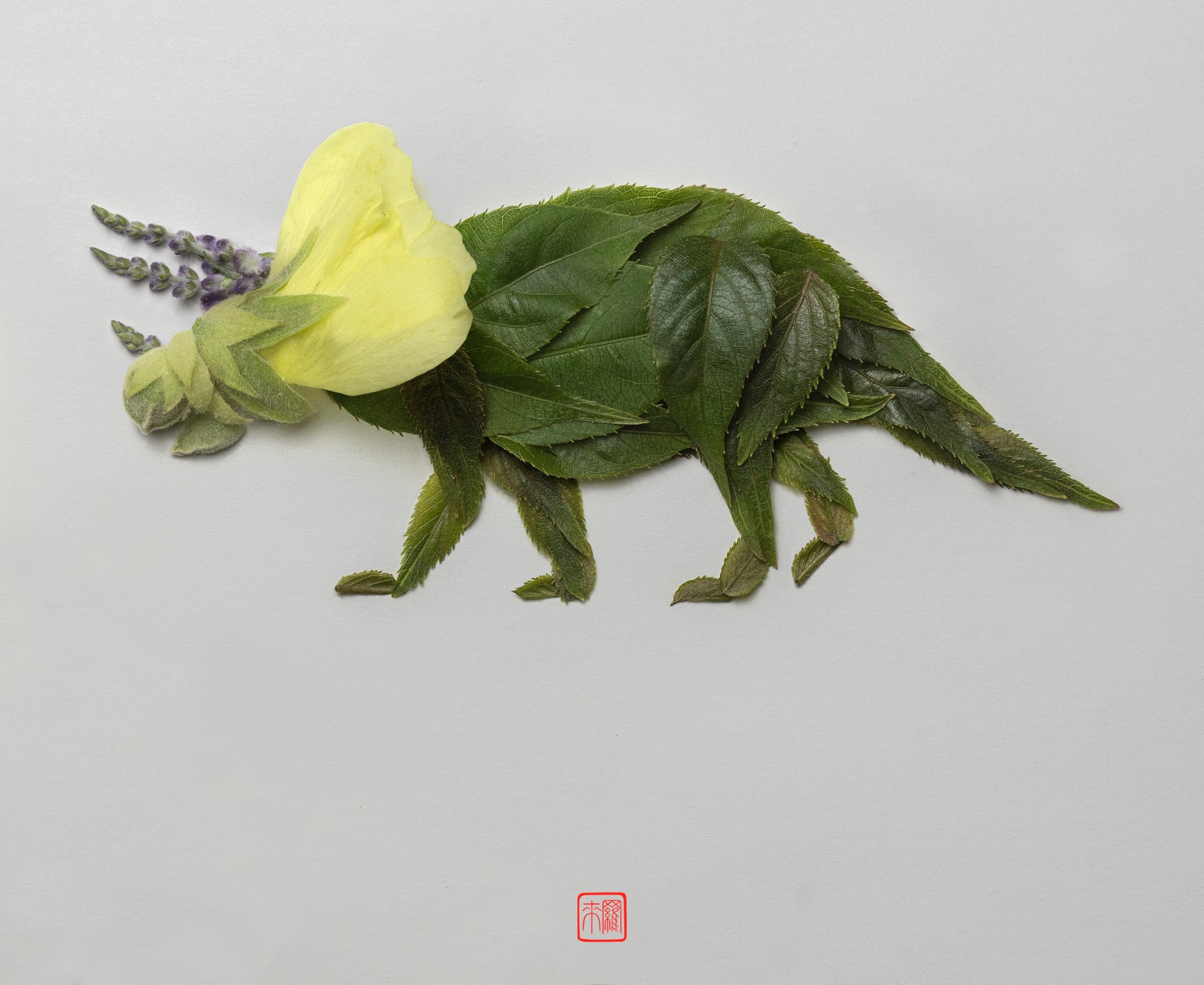 Μίνιμαλ ως προς τη μορφή και πλούσια ως προς την κατασκευή τους, στα «πλάσματα» του Inoue περιλαμβάνονται ένας στεγόσαυρος με πικραλίδα ως κεφαλή, ένας στεγόσαυρος με αγκαθωτά φύλλα σμέουρου στη ράχη και ένας βελοσιράπτορας «κεντημένος» με «μη με λησμόνει».