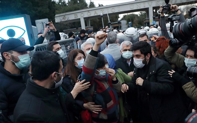 Οι τουρκικές αρχές συνέλαβαν χθες βράδυ στην Κωνσταντινούπολη 159 φοιτητές που ζητούσαν να παραιτηθεί ο νέος πρύτανης του Πανεπιστημίου του Βοσπόρου, τον οποίο διόρισε ο πρόεδρος της χώρας, καθώς και να αφεθούν ελεύθεροι φοιτητές που συνελήφθησαν διότι κρέμασαν πίνακα που τοποθετούσε στον ιερότερο τόπο του Ισλάμ σύμβολο της κοινότητας των ΛΟΑΔ.