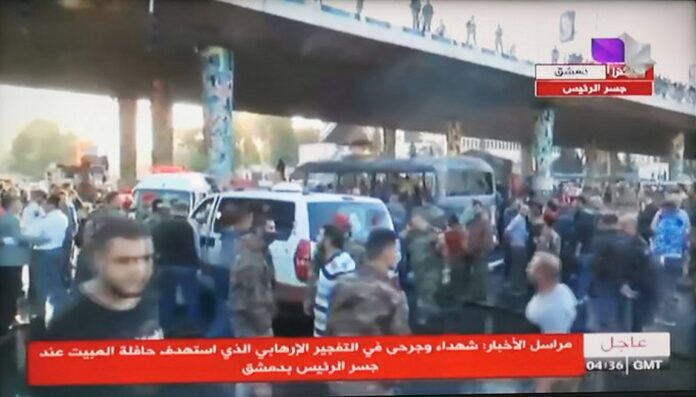 Δύο εκρηκτικοί μηχανισμοί εξερράγησαν ενώ το λεωφορείο βρισκόταν στη γέφυρα Χαφέζ αλ-Άσαντ, μετέδωσε η τηλεόραση, προσθέτοντας πως ένας τρίτος εκρηκτικός μηχανισμός εξουδετερώθηκε από πυροτεχνουργούς του στρατού.