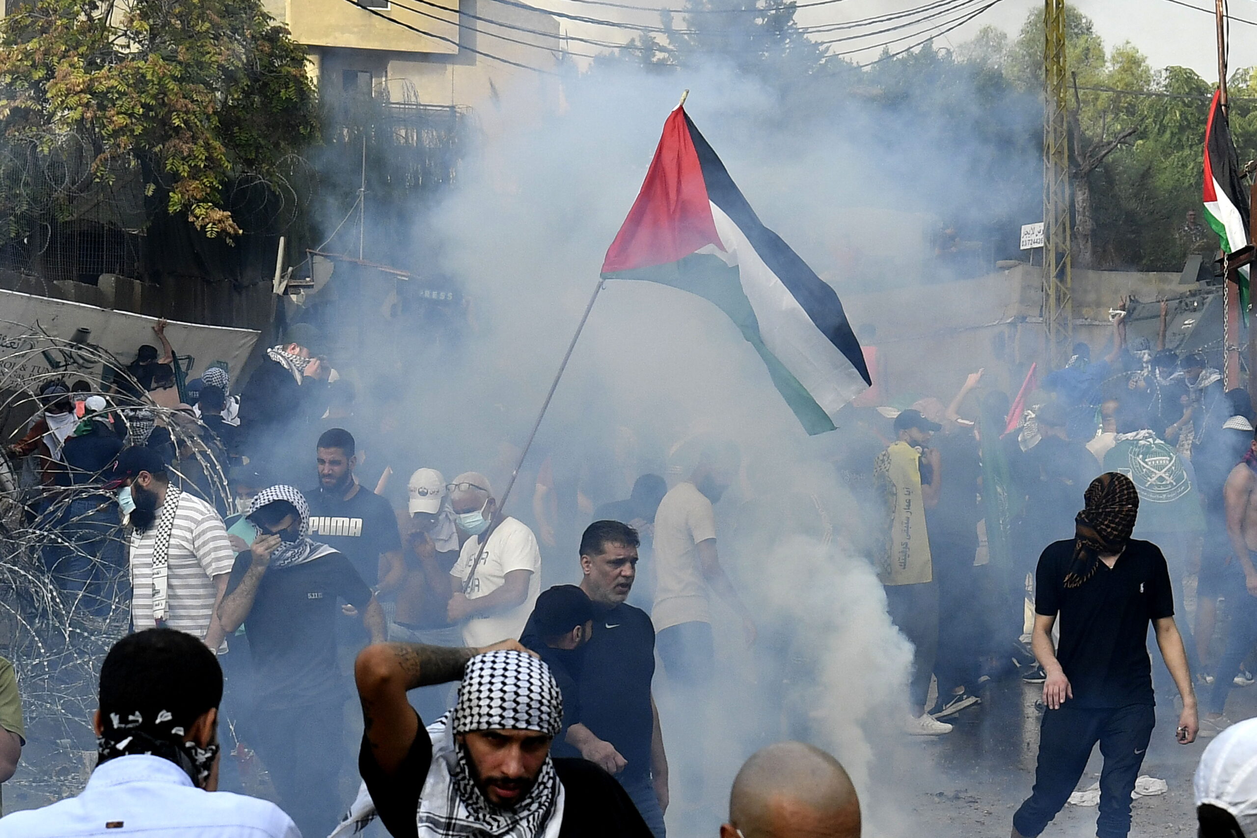 Οι διαδηλωτές, που κατηγορούν το Ισραήλ αν και Ισραηλινοί αξιωματούχοι αποδίδουν την ευθύνη για το πλήγμα αυτό στην παλαιστινιακή οργάνωση Ισλαμικός Τζιχάντ, εμποδίστηκαν να φτάσουν στην πρεσβεία, καθώς οι δρόμοι γύρω από το κτίριο, στα βόρεια προάστια της Βηρυτού, είχαν αποκλειστεί με οδοφράγματα.