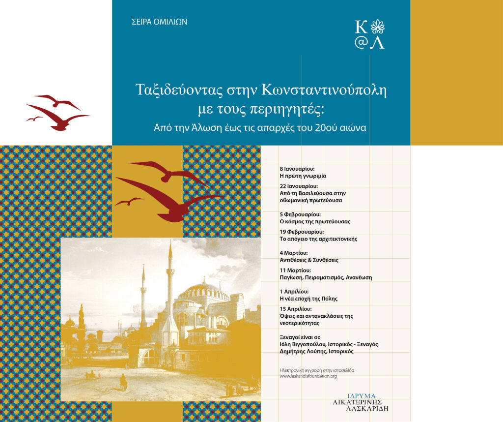 Συγκεκριμένα, μέσα από οκτώ διαδικτυακές ξεναγήσεις (8 και 22 Ιανουαρίου, 5 και 19 Φεβρουαρίου, 4 και 11 Μαρτίου και 1 και 15 Απριλίου 2024) με κεντρικό τίτλο «Ταξιδεύοντας στην Κωνσταντινούπολη με τους περιηγητές: Από την Άλωση έως τις απαρχές του 20ού αιώνα» και οδηγούς τους ιστορικούς Ιόλη Βιγγοπούλου και Δημήτρη Λούπη, οι ενδιαφερόμενοι, μέσω zoom, θα περιηγηθούν στην Κωνσταντινούπολη, ανακαλύπτοντας τους τόπους, τα μνημεία και τους ανθρώπους της από τον 16ο έως και τις αρχές του 20ού αιώνα.