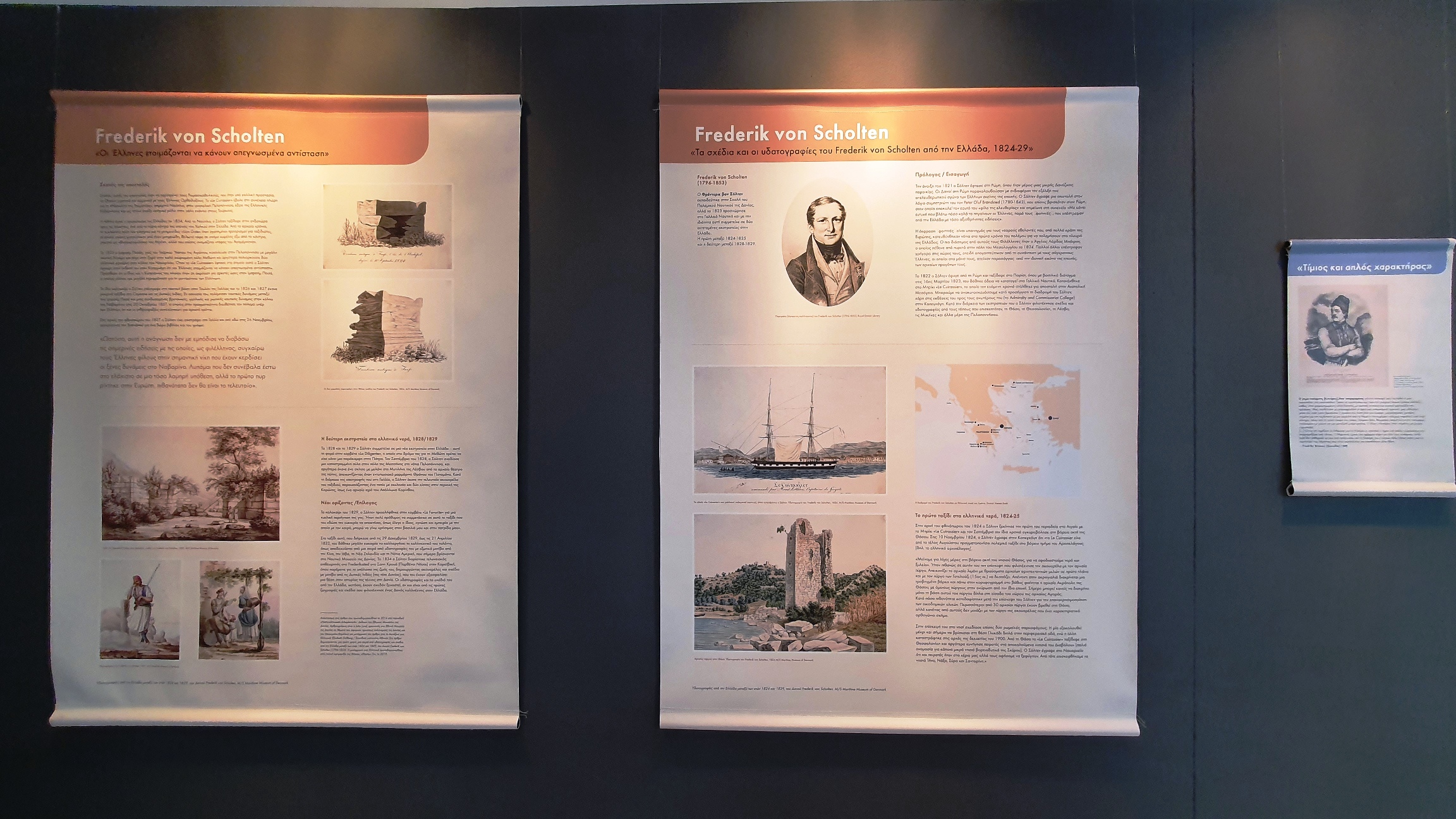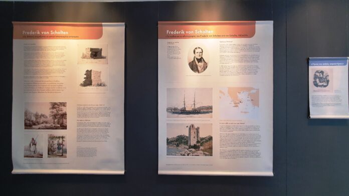 Χάρη στη δραστήρια διευθύντρια του Σουηδικού Σπιτιού στην Καβάλα, Eliσabeth Gullberg, μέσα από την επιμέλεια και τη μετάφραση ενός συγγράμματος του Εθνικού Μουσείου της Δανίας έγινε ευρέως γνωστή η δράση του Frederikvon Scholten. Στην έκθεση παρουσιάζονται όλες οι ακουαρέλες που ζωγράφισε κατά την παραμονή του στο νησί. Επίσης, με πρωτοβουλία της διευθύντριας της Εφορείας Αρχαιοτήτων Καβάλας Σταυρούλας Δαδάκη, εκτίθενται ανάγλυφα και αρχιτεκτονικά μέλη του βυζαντινού οχυρωματικού πύργου που ήταν εντοιχισμένα σε αυτόν και μετά την κατεδάφισή του περισυλλέχτηκαν, διασώθηκαν και έκτοτε φυλάσσονται στο αρχαιολογικό μουσείο της Θάσου.