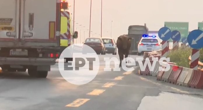 Αναστάτωση προκλήθηκε στη Θεσσαλονίκη από αγελάδα που έτρεχε ανεξέλεγκτα ανάμεσα σε οχήματα στην Εθνική Οδό, στο ύψος της Σίνδου.