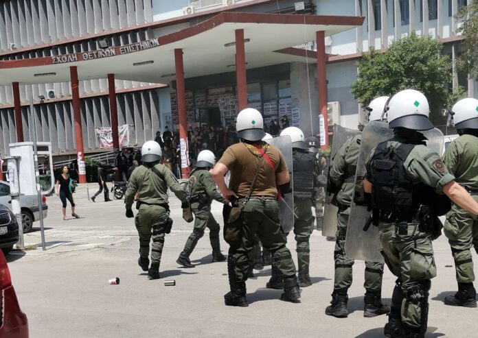Στον χώρο γύρω από τη Σχολή είναι συγκεντρωμένα και μέλη φοιτητικών παρατάξεων, που ζητούν την αποχώρηση της αστυνομίας από το CAMPUS.