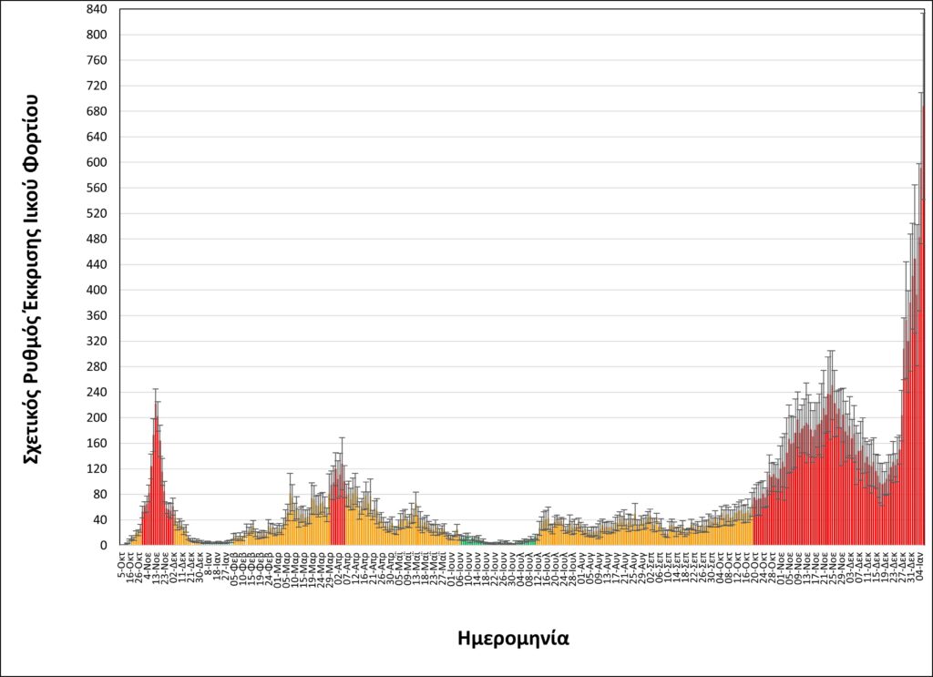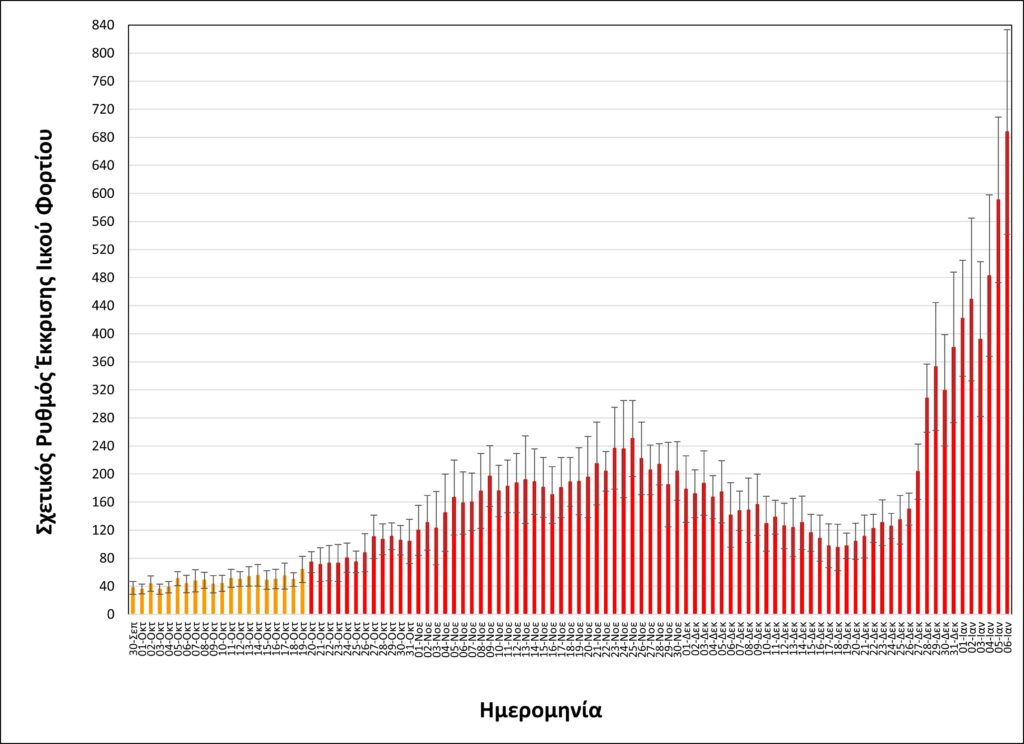 Όπως φαίνεται στα διαγράμματα που παρουσιάζει το ΑΠΕ-ΜΠΕ, έπειτα από δύο ημέρες που παρατηρήθηκαν ενδείξεις επιβράδυνσης της εκρηκτικής ανόδου του ιικού φορτίου, ακολούθησε νέα αύξησή του σε σημαντικά υψηλότερο επίπεδο.