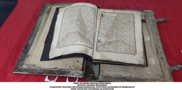 Σύμφωνα με την Αστυνομία, κατά τη διάρκεια επιχείρησης που πραγματοποιήθηκε χθες το πρωί σε κοσμηματοπωλείο ιδιοκτησίας του συλληφθέντα στο κέντρο της Θεσσαλονίκης βρέθηκαν ιερό ευαγγέλιο παλαιού τύπου και βεβαίωση παραλαβής για αυτό στην οποία αναγράφονταν τα στοιχεία 78χρονου και 242 νομίσματα.