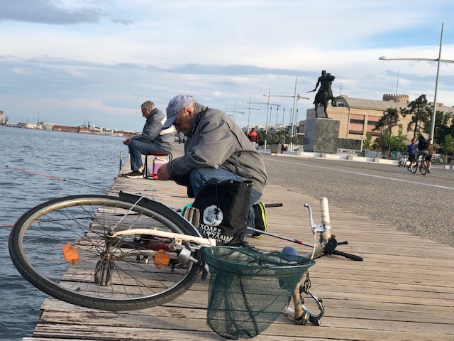 Κοντά στο άγαλμα του Μεγάλου Αλεξάνδρου, έχουν «πάρει θέση» άλλοι δύο ψαράδες. Μοιάζουν φίλοι, καθώς είναι σε μικρή απόσταση και συνομιλούν. «Εγώ είμαι ο αρχαιότερος ηλικιακά της παρέας αλλά νέος στο ψάρεμα… έρχομαι τα τελευταία χρόνια», λέει ο Μιχάλης και διευκρινίζει πως δεν έρχεται στην παράλια μόνο για το ψάρεμα, αλλά περισσότερο για την παρέα. «Στις είκοσι φορές που έρχεσαι εδώ, μια φορά πιάνεις ψάρια, είναι όμως ωραία, γελάμε μεταξύ μας, περνάει όμορφα η ώρα μας. Όταν δεν φυσάει κατεβαίνω για να με “χτυπήσει” λίγο ο ήλιος, από τότε που βγήκα στη σύνταξη».