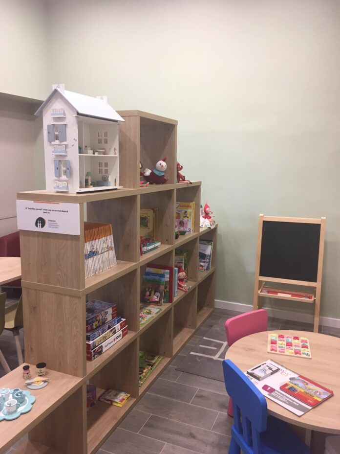 Τα επιτραπέζια παιχνίδια, τα πολύχρωμα λούτρινα ζωάκια και τα εικονογραφημένα βιβλία έχουν ήδη πάρει τη θέση τους στην ξύλινη βιβλιοθήκη, που έχει τοποθετηθεί στο κέντρο της αίθουσας.