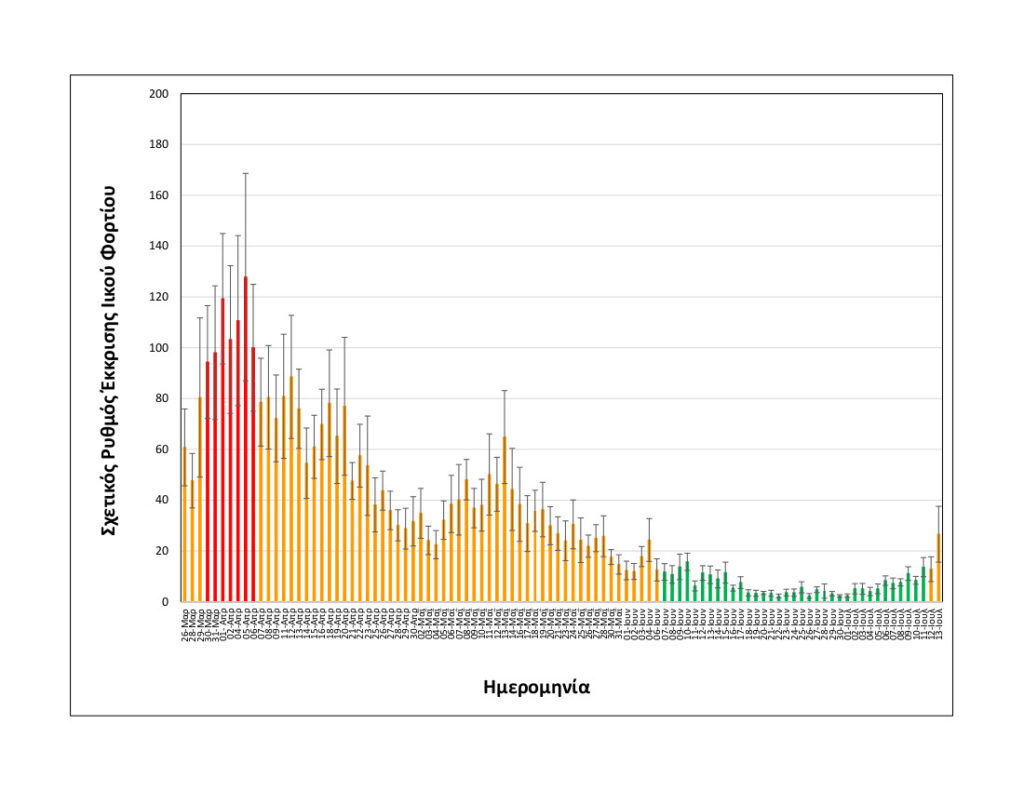 Όπως φαίνεται στα διαγράμματα που παρουσιάζει το ΑΠΕ-ΜΠΕ το ιικό φορτίο απεικονίζεται πλέον σε πορτοκαλί επίπεδο επιδημιολογικού συναγερμού, με την τάση από μέρα σε μέρα, σε σύγκριση με την αντίστοιχη στην έναρξη του τρίτου κύματος της πανδημίας, να αποτυπώνεται πιο έντονα αυξητική.