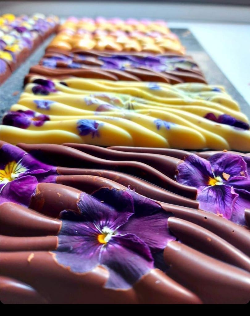Μεταξύ των βρώσιμων λουλουδιών που έχουν …κρυφτεί μέσα στις σοκολατένιες δημιουργίες, συμπεριλαμβάνονται σύμφωνα με την ίδια, βιόλες, φλόγες, γκάβρια, γαρύφαλλο, το «λουλούδι της ωραίας Ελένης», το βοράγκιο και το κενταύριο ,το βότανο που σύμφωνα με τη μυθολογία που θεράπευσε το κένταυρο Χείρωνα στη μάχη των Τιτάνων όταν τον χτύπησε ο Ηρακλής.