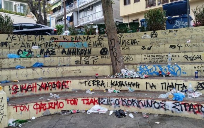 Παντού τσίκνα, εμετοί και έντονη μπόχα από αλκοόλ και χασίς. Γράφουν συνθήματα και κάνουν γκράφιτι, στην πλατεία αλλά και στα σπίτια μας που για να τα βάψουμε πληρώνουμε από το υστέρημα μας. Το πρωί βάφει ο δήμος την πλατεία και την άλλη μέρα υπάρχουν παντού συνθήματα καινούρια γραμμένα.