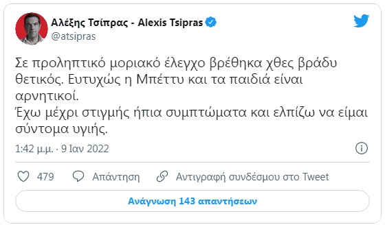 Αναλυτικά όσα έγραψε ο πρόεδρος του ΣΥΡΙΖΑ στο Twitter: «Σε προληπτικό μοριακό έλεγχο βρέθηκα χθες βράδυ θετικός. Ευτυχώς η Μπέττυ και τα παιδιά είναι αρνητικοί. Έχω μέχρι στιγμής ήπια συμπτώματα και ελπίζω να είμαι σύντομα υγιής».