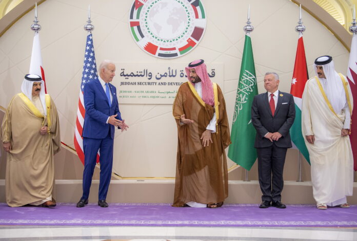 Στην ομιλία που εκφώνησε στην Τζέντα, στη σύνοδο όπου μετείχαν έξι μέλη του Συμβουλίου Συνεργασίας του Κόλπου (GCC – Σαουδική Αραβία, Ηνωμένα Αραβικά Εμιράτα, Κατάρ, Ομάν, Κουβέιτ, Μπαχρέιν) καθώς επίσης και η Αίγυπτος, το Ιράκ και η Ιορδανία, ο Μπάιντεν υποσχέθηκε ότι η χώρα του «δεν θα γυρίσει την πλάτη» στη Μέση Ανατολή, αφήνοντας ένα κενό το οποίο θα μπορούσαν να καλύψουν «η Κίνα, η Ρωσία ή το Ιράν».