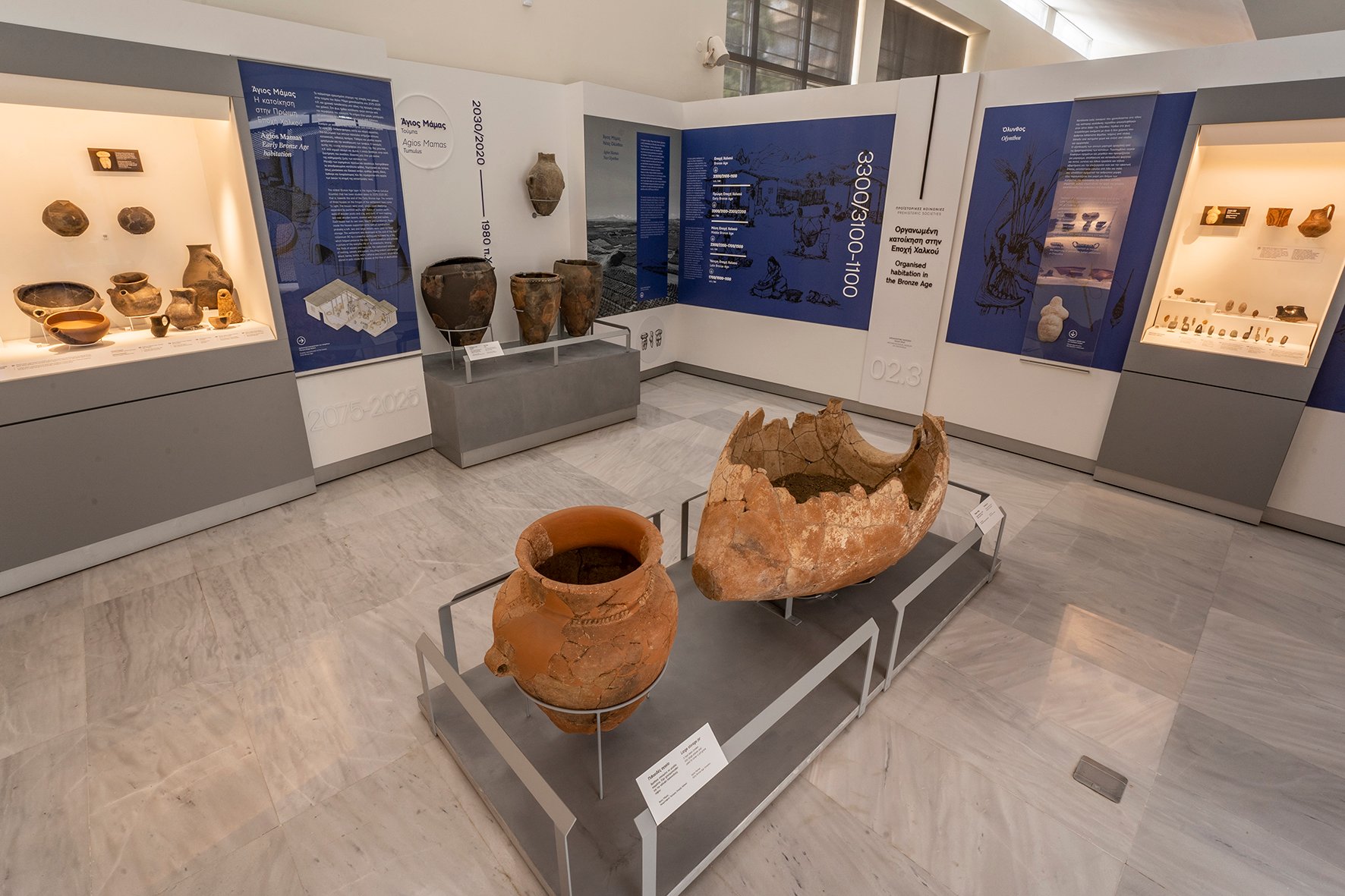 Η έκθεση του νέου Μουσείου αναπτύσσεται σε τέσσερις θεματικές ενότητες: Τόπος και Ιστορία, Προϊστορικές κοινωνίες, Ιστορικοί χρόνοι, Συλλογές και Δωρεές. Παρουσιάζονται ευρήματα από τους πιο σημαντικούς προϊστορικούς οικισμούς και νεκροταφεία της Χαλκιδικής, τον ‘Αγιο Μάμα, την Όλυνθο και την Τορώνη, το Κριαρίτσι και τη Νέα Σκιώνη, ενώ επιλεγμένα εκθέματα των ρωμαϊκών χρόνων, επιτύμβια αγάλματα και στήλες, προετοιμάζουν τον επισκέπτη πριν την ολοκλήρωση της ενότητας Ιστορικοί Χρόνοι.