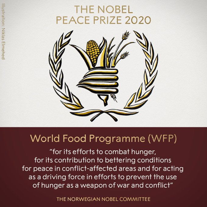 Το Νόμπελ Ειρήνης 2020 ανακοινώθηκε από την Σουηδική Ακαδημία και απονεμήθηκε στο Παγκόσμιο Πρόγραμμα Επισιτισμού του ΟΗΕ