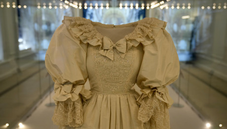 Την απόφαση να δανείσουν στην έκθεση το νυφικό της μητέρας τους, πήραν οι πρίγκιπες Ουίλιαμ και Χάρι. Το περίτεχνο φόρεμα σχεδιάστηκε από τον Ντέιβιντ και Ελίζαμπεθ Εμμάνουελ και είχε το πιο μακρύ πέπλο στη βασιλική ιστορία, το οποίο είχε ουρά μήκους 7,6 μέτρων και ήταν κεντημένο με 10.000 πούλιες με μαργαριτάρι. Είχε φουσκωτά μανίκια, εντυπωσιακή φούστα και περίτεχνα σχέδια στο μπούστο από αντίκες δαντέλες που ανήκαν στην γιαγιά του Καρόλου.