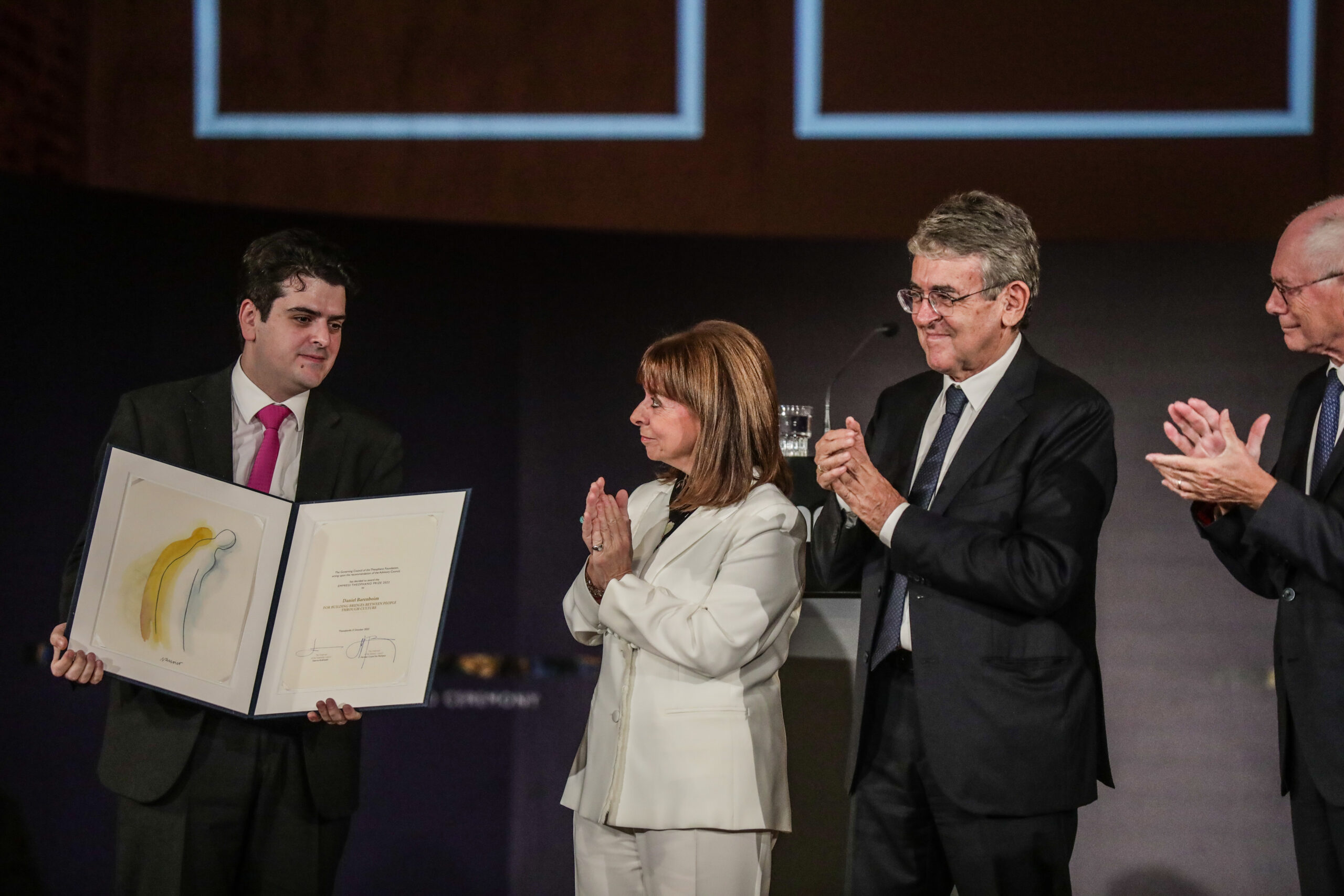 “Έναν έξοχο πιανίστα αλλά και ταυτόχρονα έναν μέγα ανθρωπιστή, έναν γενναίο διανοούμενο και έναν βαθύτατα δημοκρατικό πολίτη”, χαρακτήρισε η Πρόεδρος της Δημοκρατίας Κατερίνα Σακελλαροπούλου τον αρχιμουσικό Ντάνιελ Μπάρενμπόιμ, απονέμοντάς του το Βραβείο “Αυτοκράτειρα Θεοφανώ” του ομώνυμου Ιδρύματος, στη διάρκεια τελετής που πραγματοποιήθηκε, παρουσία του πρωθυπουργού, Κυριάκου Μητσοτάκη, στο Μνημείο της Ροτόντας.