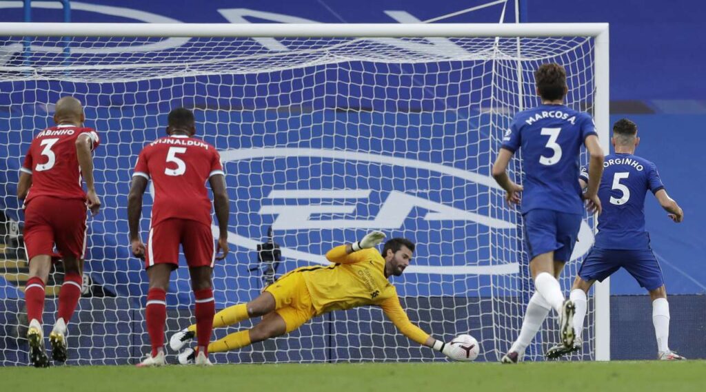 Στο 72′ ο Ο Thiago Alcantara προσπάθησε να πάρει την μπάλα αλλά βρήκε και τα πόδια του αντιπάλου. Η Τσέλσι κέρδισε πέναλτι αλλά ο Άλισον απέκρουσε το σούτ του Jorginho.