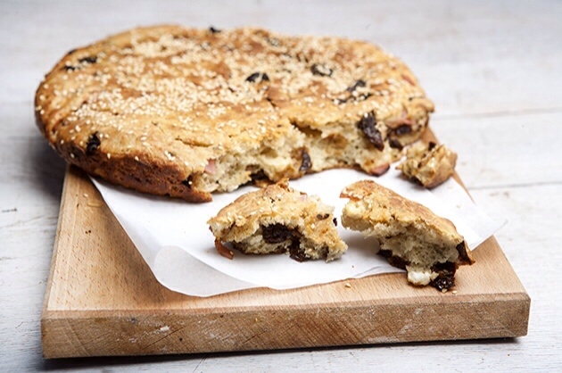 Αναποδογυρίζουμε την μπάλα ζύμης με τις ενώσεις να ακουμπάνε στο ταψί. Πατάμε με τα δάχτυλα την επιφάνεια να απλώσει το σχήμα και να πάρει το σχήμα του ταψιού. Αλείφουμε όλη την επιφάνεια με λάδι και πασπαλίζουμε σουσάμι. Σκεπάζουμε κι αφήνουμε να σταθεί για 40′ σε ζεστό σημείο να φουσκώσει.