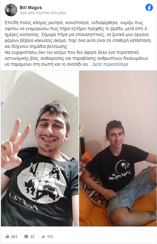 Υπενθυμίζεται πως ο νεαρός ένα μήνα πριν είχε καταγγείλει αστυνομική βία στο πλαίσιο του συλλαλητηρίου, ενώ όπως ο ίδιος ανέφερε νοσηλεύτηκε στο Νοσοκομείο Βόλου με κατάγματα στα πλευρά και θλάση στο συκώτι.