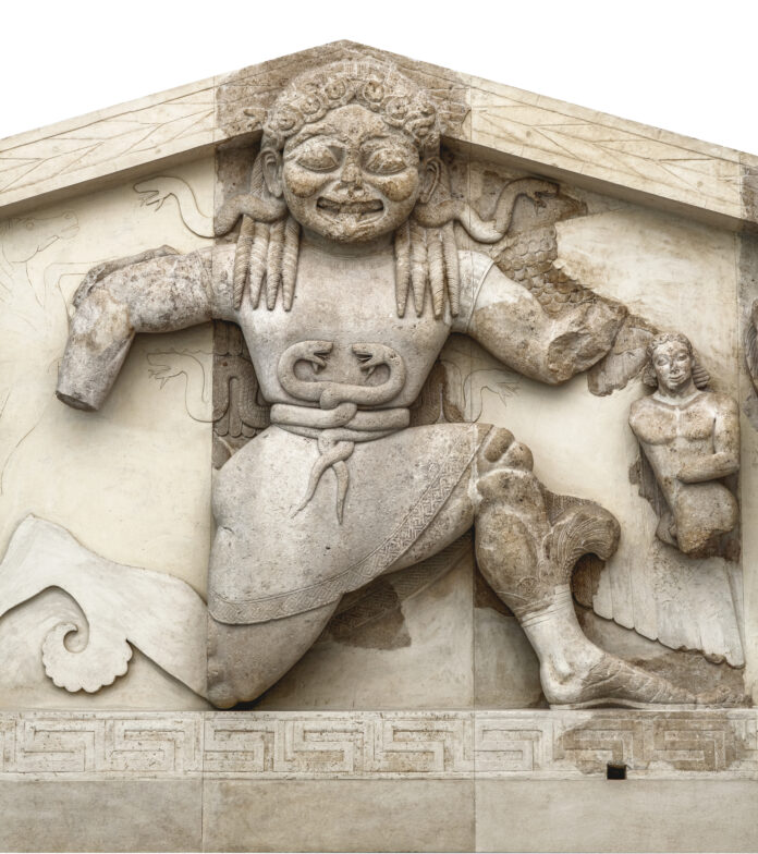 Άλλη ενότητα αφορά το χρονικό της αρχαιολογικής έρευνας. «Στις αρχές του 20ού αιώνα η τυχαία ανεύρεση στην περιοχή της Μονής των Αγίων Θεοδώρων κάποιων γλυπτών σπαραγμάτων οδήγησε στην ανακάλυψη του αρχαϊκού ναού της Αρτέμιδος. Η ανασκαφή άρχισε τον Ιανουάριο του 1911 από τον έφορο Αρχαιοτήτων Φρειδερίκο Βερσάκη, ο οποίος σε σύντομο χρονικό διάστημα αποκάλυψε όλα τα γλυπτά μέρη από το δυτικό αέτωμα του ναού, όπου δέσποζε η δαιμονική μορφή της Γοργούς… Η ανασκαφή συνεχίστηκε από το Γερμανικό Αρχαιολογικό Ινστιτούτο, με διευθυντή τον αρχιτέκτονα και αρχαιολόγο Wilhelm Dörpfeld, ύστερα από παρέμβαση του Κάιζερ Γουλιέλμου της Γερμανίας, ο οποίος είχε αγοράσει το Αχίλλειο μετά τον θάνατο της Σίσσυς και επισκεπτόταν συχνά την Κέρκυρα. Η αποκάλυψη του αετώματος της Γοργούς αποτέλεσε μεγάλη είδηση στον Τύπο της εποχής», σημειώνει η διευθύντρια της ΕΦΑ Κέρκυρας για το εντυπωσιακό εύρημα, που συνδέεται και με άλλες, νεότερες, ιστορίες του νησιού.