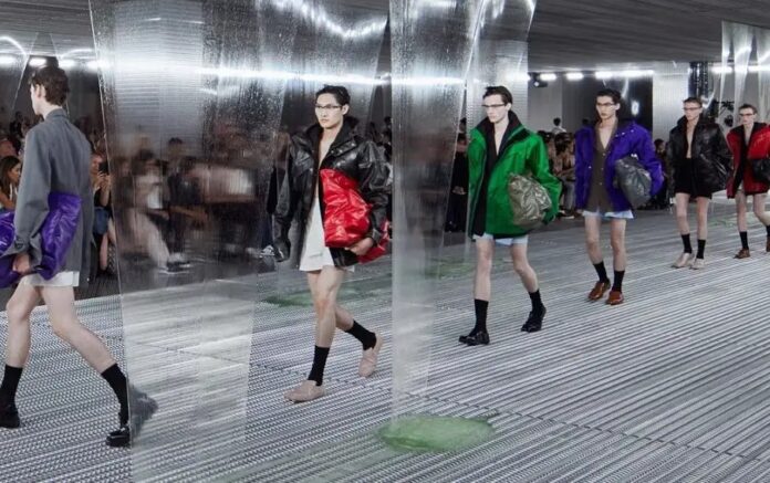 Χώρο καλυμμένο με αλουμίνιο και με γλίτσα να πέφτει από την οροφή δημιουργώντας υγρούς τοίχους σχεδίασε το ολλανδικό στούντιο AMO για το show της ανδρικής κολεξιόν ‘Ανοιξη-Καλοκαίρι 2024 του οίκου Prada.
