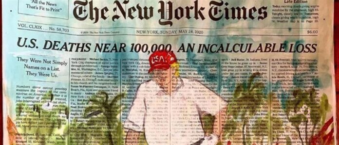 Ο εορτασμός της Memorial Day στις ΗΠΑ από τον Ντόναλντ Τραμπ με το να ταξιδεύει στη Βιρτζίνια για να παίξει γκολφ το ίδιο Σαββατοκύριακο που το φύλλο των Τάιμς της Νέας Υόρκης κυκλοφόρησε με πρωτοσέλιδο στο οποίο ήταν τυπωμένα ονόματα νεκρών από τον ιό προκάλεσε θυμωμένες αντιδράσεις από πολλούς καλλιτέχνες στις ΗΠΑ. Και ζωγράφισαν τον 45ο Πρόεδρο των ΗΠΑ να παίζει γκολφ κάτω από τον τίτλο του πρωτοσέλιδου «Οι θάνατοι στις ΗΠΑ πλησιάζουν τους 100.000, μια ανυπολόγιστη απώλεια».